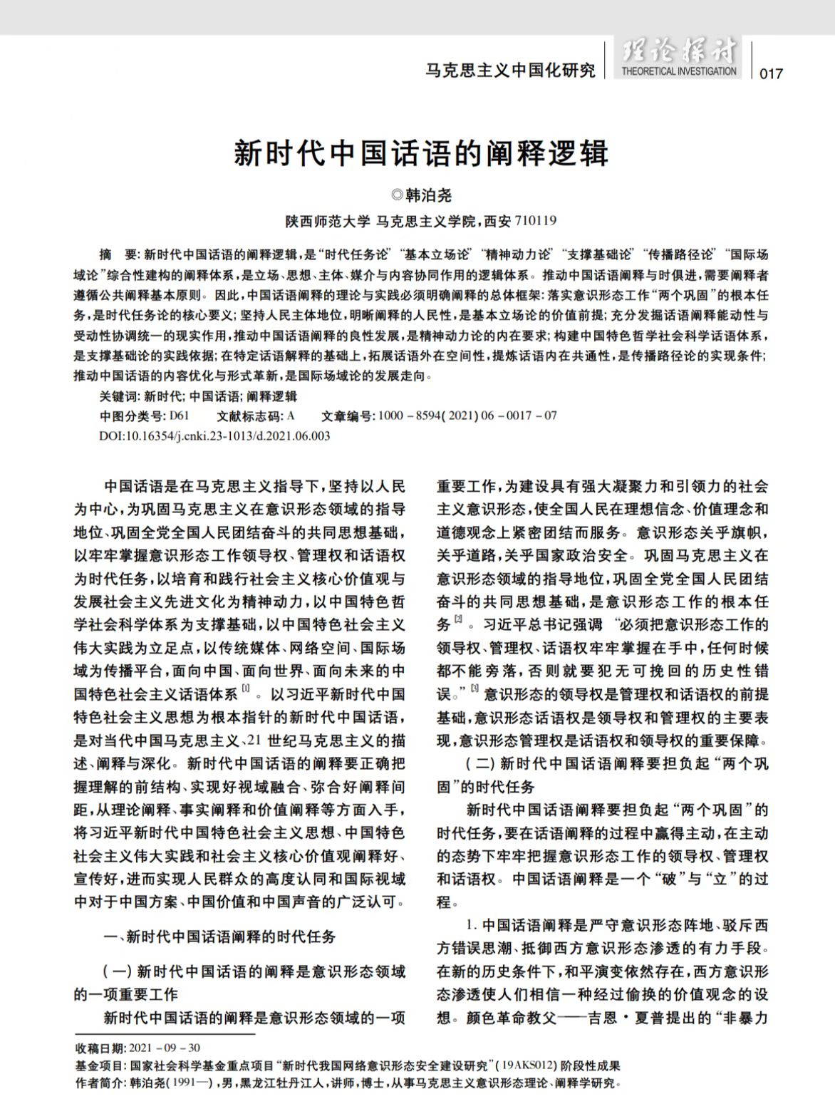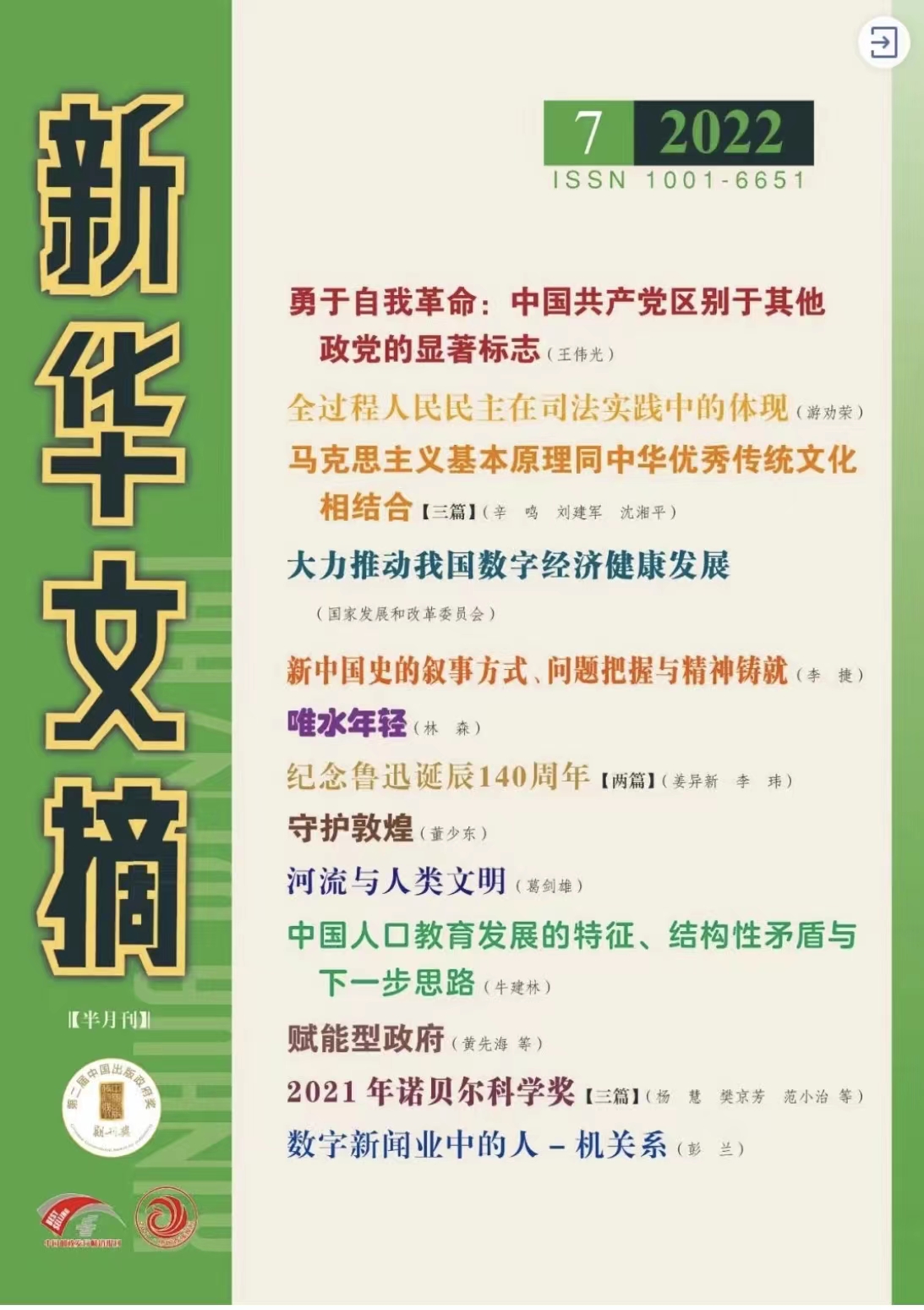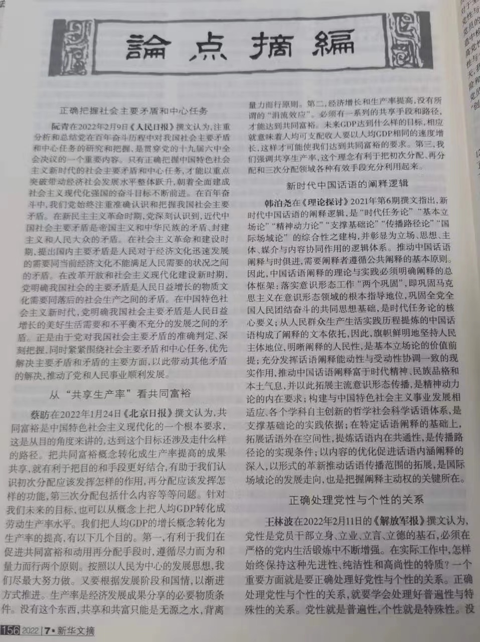 《新华文摘》2022年第7期论点摘编公司韩泊尧讲师文章《新时代中国话语的阐释逻辑》,原文刊登于《理论探讨》2021年第6期。