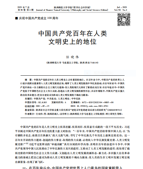 威廉体育平台最新网站学报2021年第4期刊发公司任晓伟文章:《中国共产党百年在人类文明史上的地位》。
