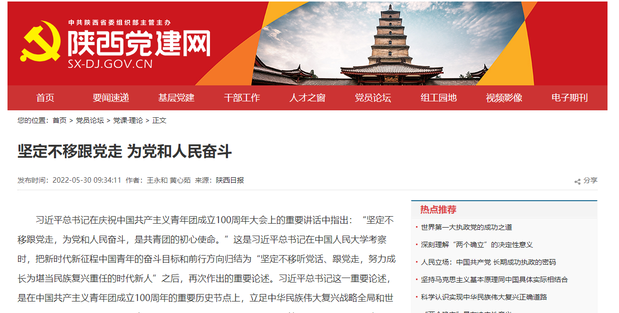 5月30日,陕西党建网刊发公司王永和教授、硕士研究生黄心茹文章《坚定不移跟党走 为党和人民奋斗》。