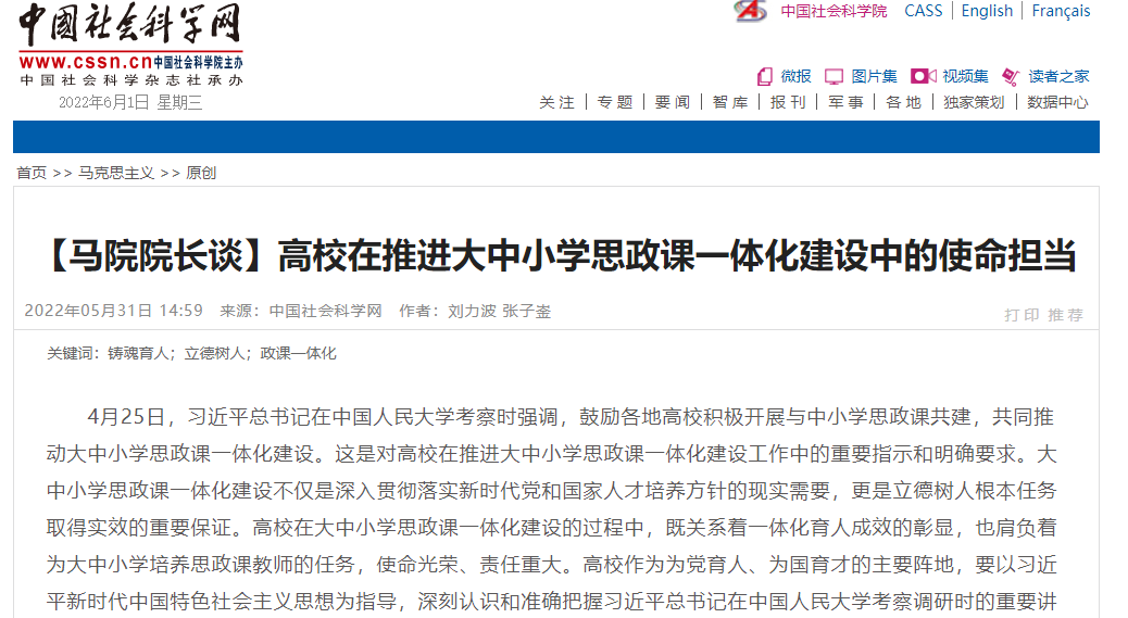 6月1日,中国社会科学网刊发公司经理刘力波教授、博士研究生张子崟文章《【williamhill体育网页版经理谈】高校在推进大中小学思政课一体化建设中的使命担当》。