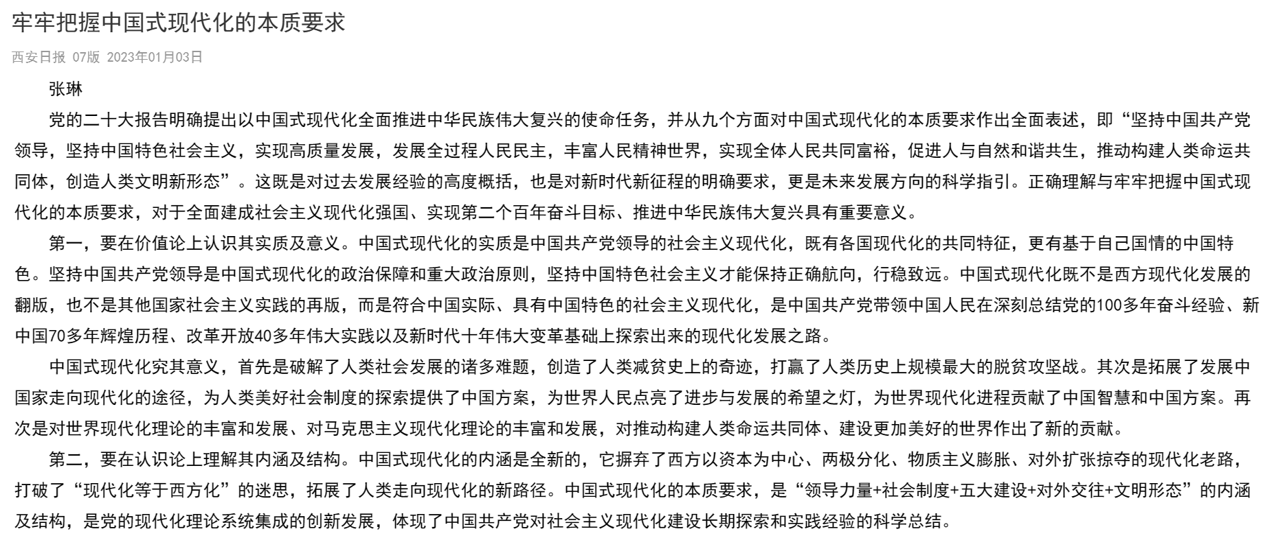 1月3日,《西安日报》刊发公司张琳文章:《牢牢把握中国式现代化的本质要求》