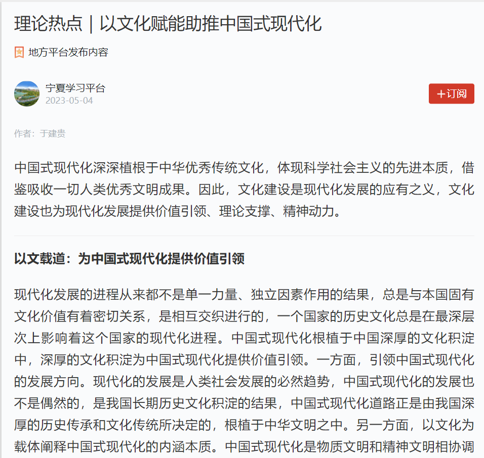 5月4日,《学习强国》刊发学院博士研究生于建贵文章:《以文化赋能助推中国式现代化》