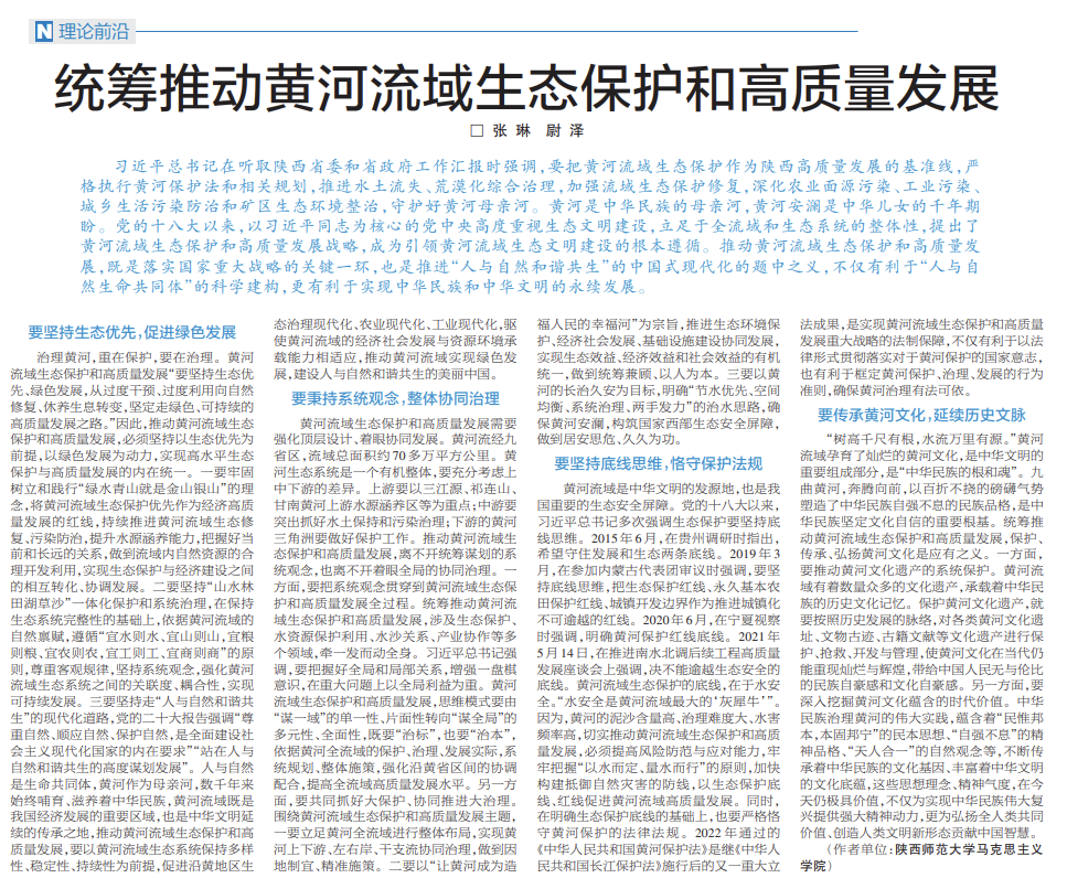 习近平总书记在听取陕西省委和省政府工作汇报时强调,要把黄河流域生态保护作为陕西高质量发展的基准线,严格执行黄河保护法和相关规划,推进水土流失、荒漠化综合治理,加强流域生态保护修复,深化农业面源污染、工业污染、城乡生活污染防治和矿区生态环境整治,守护好黄河母亲河。黄河是中华民族的母亲河,黄河安澜是中华儿女的千年期盼。党的十八大以来,以习近平同志为核心的党中央高度重视生态文明建设,立足于全流域和生态系统的整体性,提出了黄河流域生态保护和高质量发展战略,成为引领黄河流域生态文明建设的根本遵循。推动黄河流域生态保护和高质量发展,既是落实国家重大战略的关键一环,也是推进“人与自然和谐共生”的中国式现代化的题中之义,不仅有利于“人与自然生命共同体”的科学建构,更有利于实现中华民族和中华文明的永续发展。