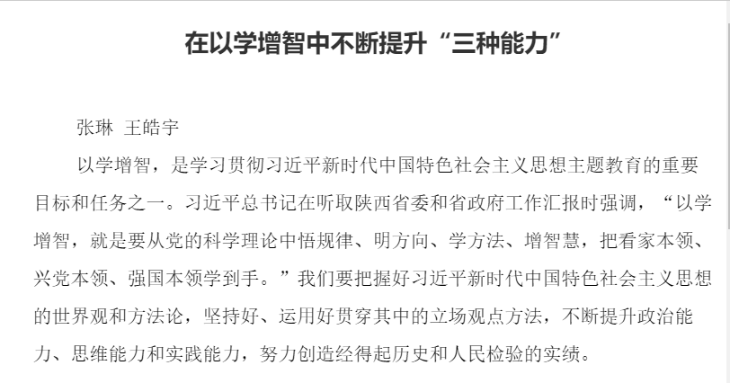 9月14日,《陕西日报》刊发学院张琳、王皓宇文章:《在以学增智中不断提升“三种能力”》。