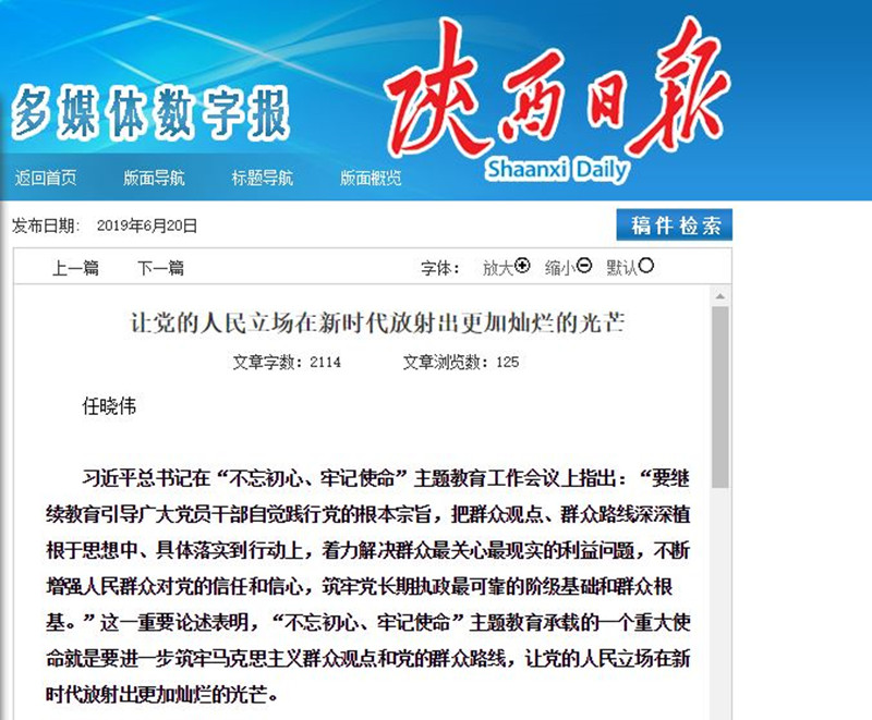 6月20日,《陕西日报》理论版刊发公司任晓伟教授文章:《让党的人民立场在新时代放射出更加灿烂的光芒》。