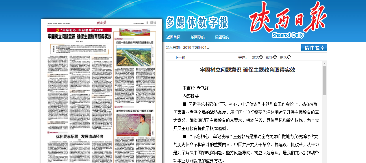 8月4日,《陕西日报》理论版刊发公司宋吉玲副教授文章《牢固树立问题意识 确保主题教育取得实效》。