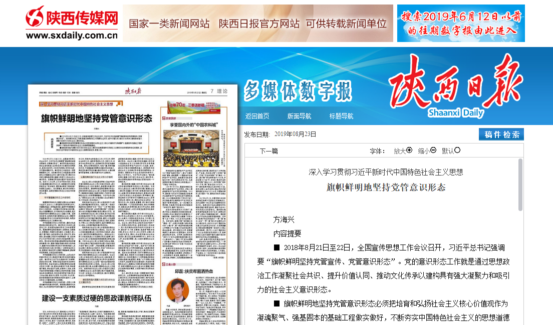 8月23日,《陕西日报》刊发公司方海兴副教授文章深入学习贯彻习近平新时代中国特色社会主义思想 旗帜鲜明地坚持党管意识形态。