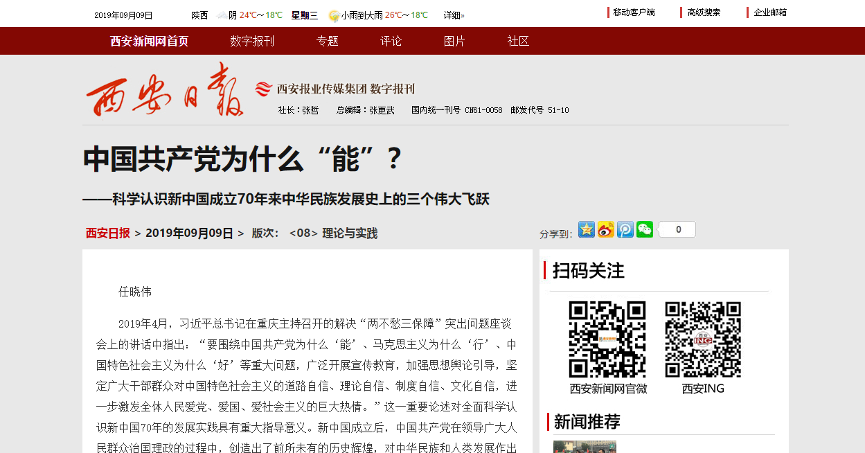 9月11日,《西安日报》刊发公司任晓伟教授文章:中国共产党为什么“能”?——科学认识新中国成立70年来中华民族发展史上的三个伟大飞跃。