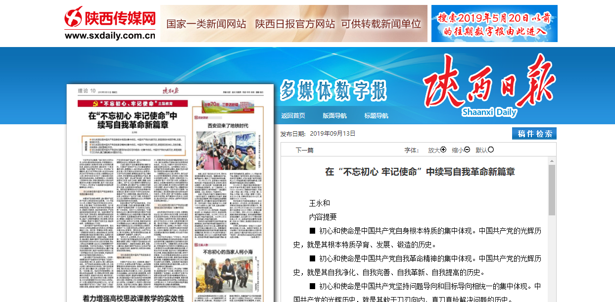 9月13日,《陕西日报》刊发公司王永和教授文章:在“不忘初心 牢记使命”中续写自我革命新篇章。
