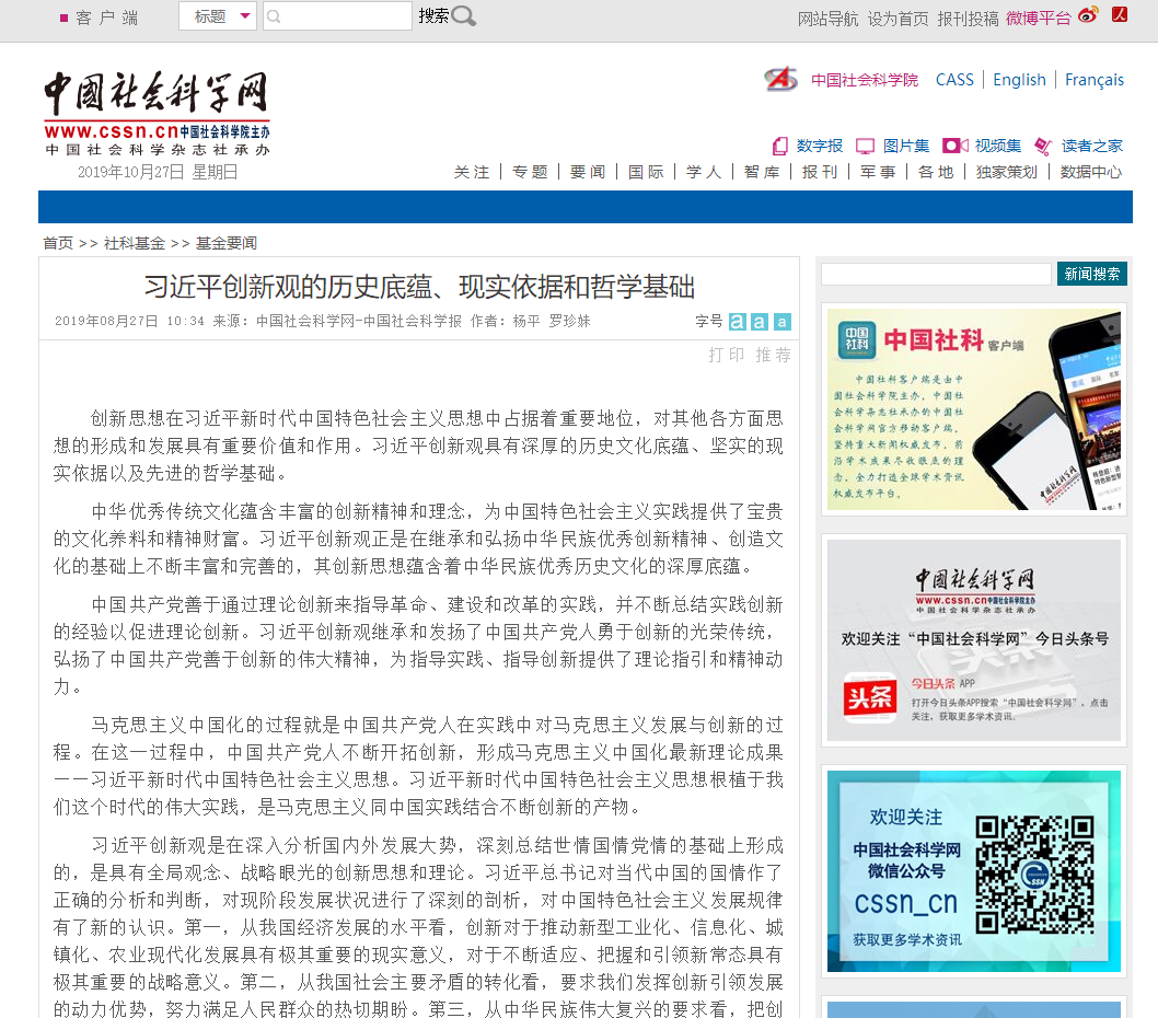 8月27日,社会科学网刊发公司杨平教授,硕士研究生罗珍妹文章《习近平创新观的历史底蕴、现实依据和哲学基础》。