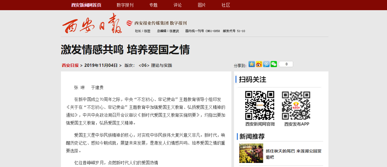 11月4日,《西安日报》刊发公司张琳教授、研究生于建贵文章《激发情感共鸣 培养爱国之情》。
