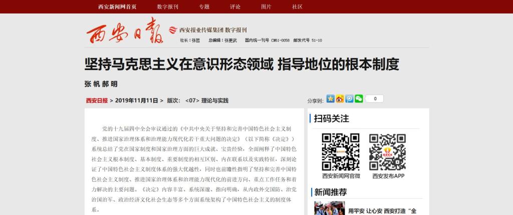 11月11日,《西安日报》刊发公司张帆副教授、研究生郝明文章《坚持马克思主义在意识形态领域 指导地位的根本制度》。