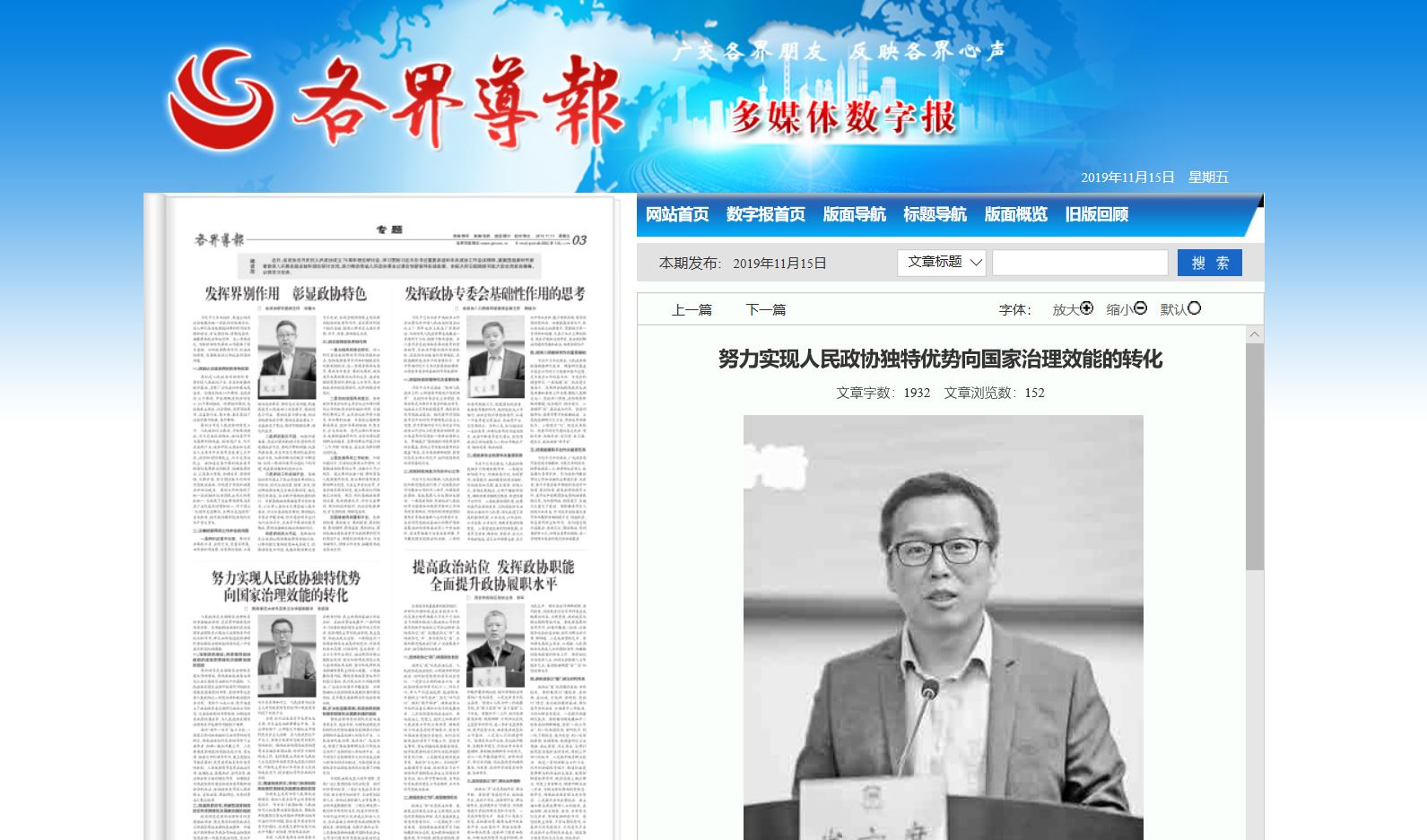 11月15日,《各界导报》刊发公司张亚泽副教授文章:努力实现人民政协独特优势向国家治理效能的转化。