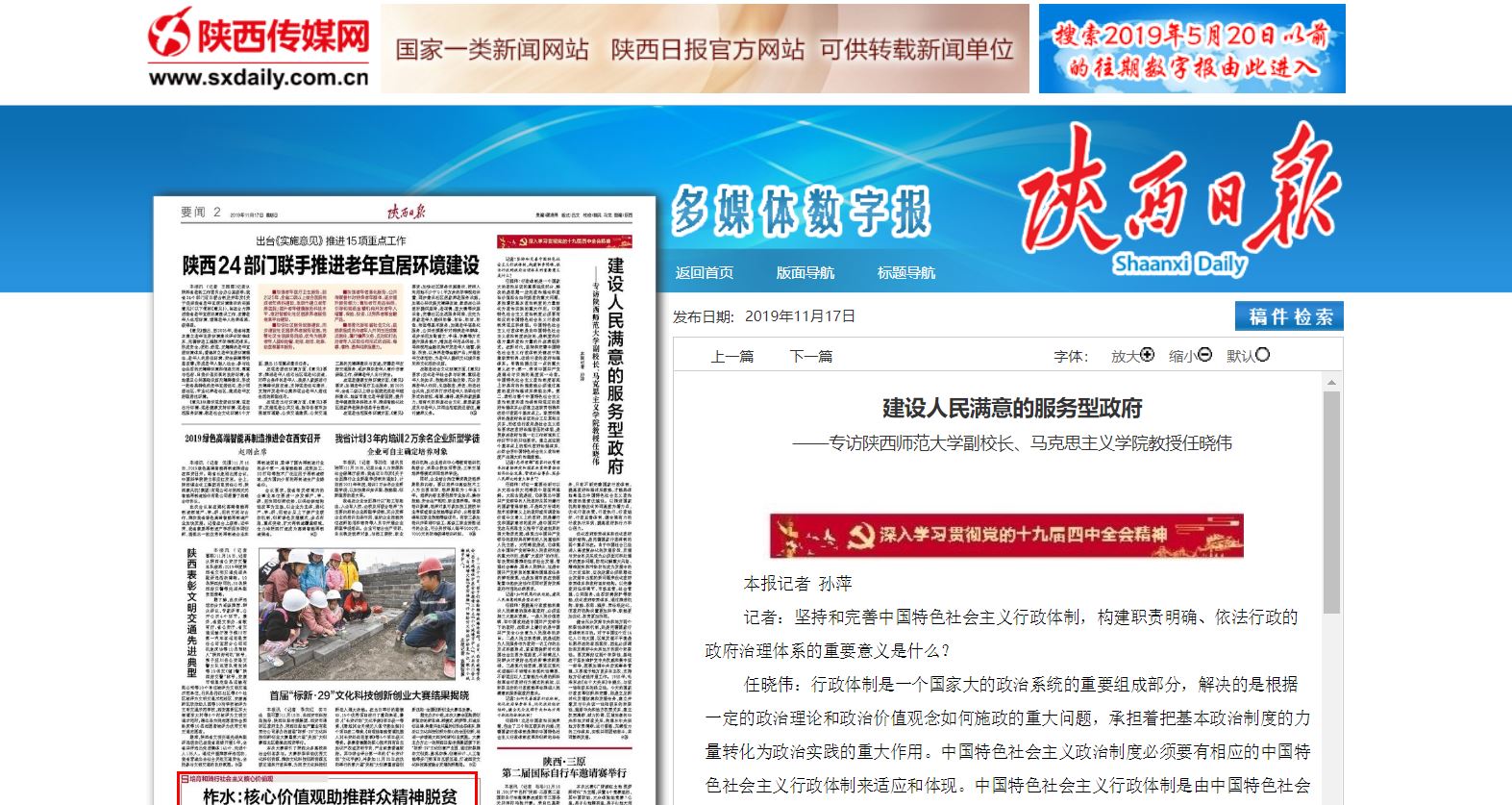 11月17日,《陕西日报》刊发报道:建设人民满意的服务型政府 ——专访威廉体育平台最新网站副董事长、williamhill体育网页版教授任晓伟。
