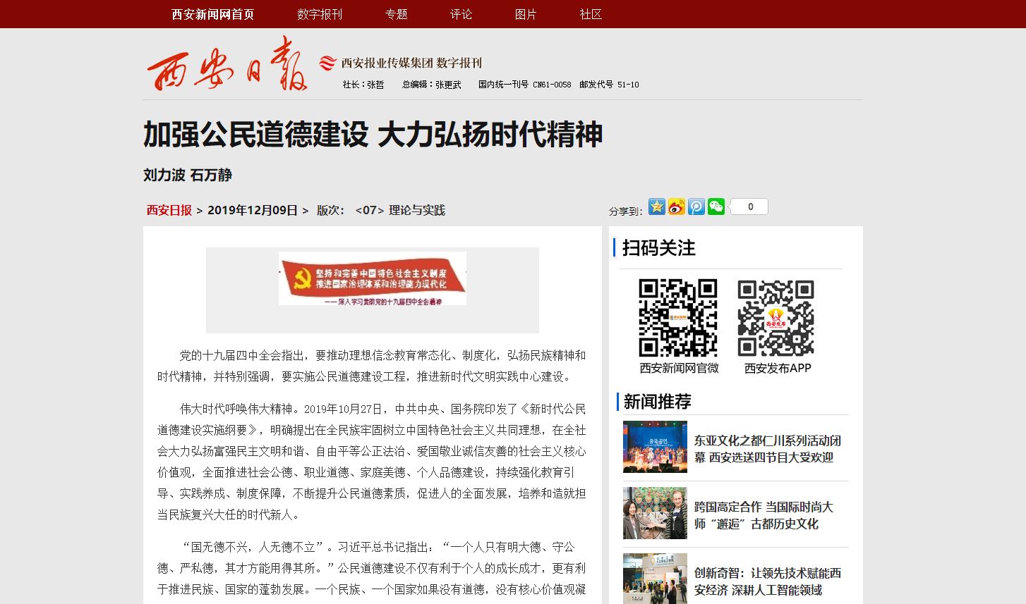 12月9日,《西安日报》刊发公司教授刘力波、研究生石万静文章:《加强公民道德建设 大力弘扬时代精神》。