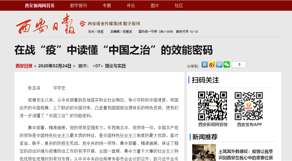 2月24日,《西安日报》刊发公司张亚泽副教授、研究生邓宇宏文章:在战“疫”中读懂“中国之治”的效能密码。