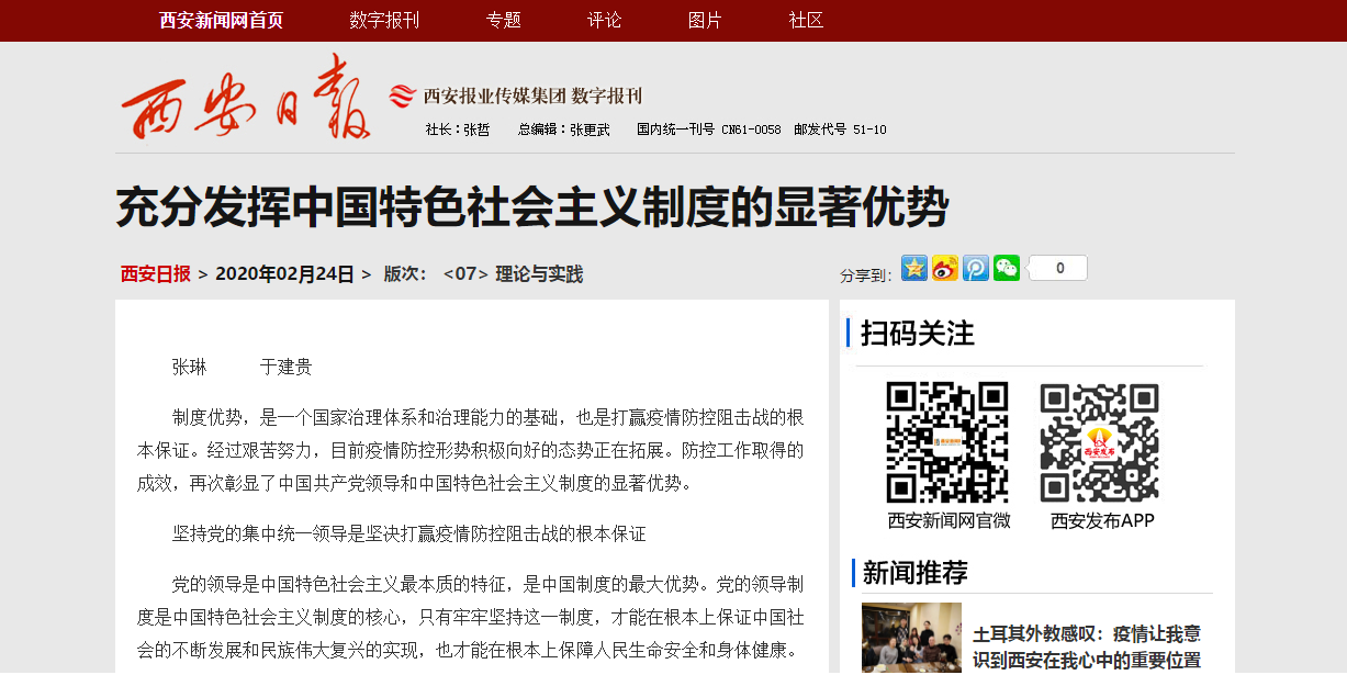 2月24日,《西安日报》刊发公司张琳教授、研究生于建贵文章:充分发挥中国特色社会主义制度的显著优势。