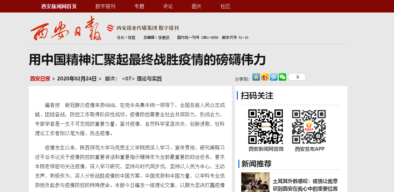 2月24日,《西安日报》刊发公司党委书记闫文浩文章:用中国精神汇聚起最终战胜疫情的磅礴伟力。
