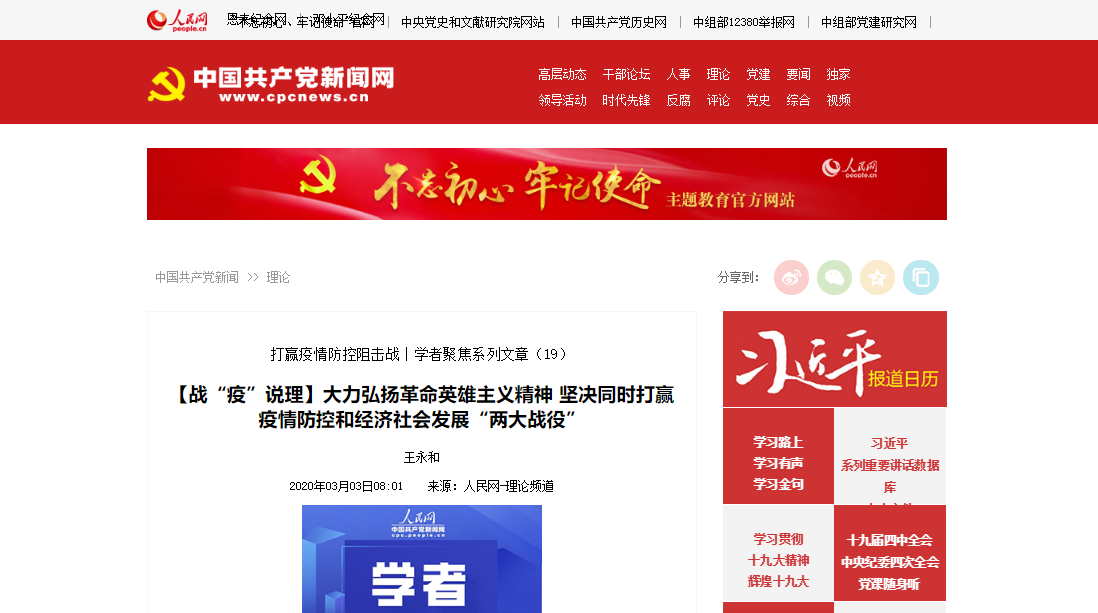 3月3日,人民网理论频道刊发王永和教授文章:大力弘扬革命英雄主义精神 坚决同时打赢疫情防控和经济社会发展“两大战役”。