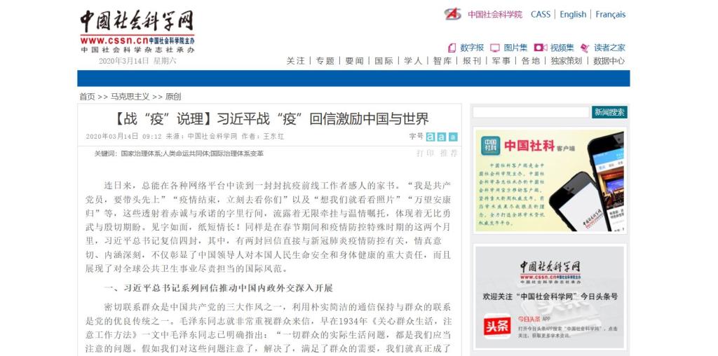 3月14日,中国社会科学报刊发公司王东红副教授文章:习近平战“疫”回信激励中国与世界。