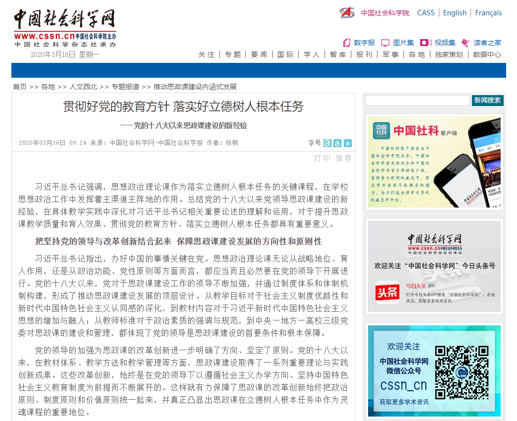 3月16日,中国社会科学网刊发公司副教授张帆文章:《贯彻好党的教育方针 落实好立德树人根本任务——党的十八大以来思政课建设的新经验》