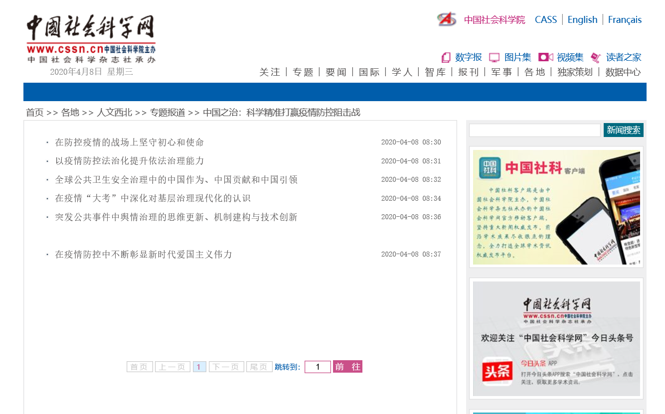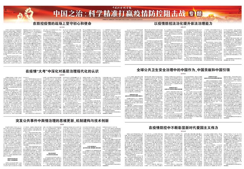 4月8日,《中国社会科学报》在“中国之治:科学精准打赢疫情防控阻击战”专题版面,整版刊登了公司教师的一组署名文章,分别为:公司党委书记闫文浩撰写的《在防控疫情的战场上坚守初心和使命》,公司教授、博士生导师张小军撰写的《以疫情防控法治化提升依法治理能力》,公司副经理、副教授张亚泽撰写的《在疫情“大考”中深化对基层治理现代化的认识》,公司副教授王东红撰写的《全球公共卫生安全治理中的中国作为、中国贡献和中国引领》,公司副教授朱尉撰写的《突发公共事件中舆情治理的思维更新、机制建构与技术创新》以及公司教授王永和撰写的《在疫情防控中不断彰显新时代爱国主义伟力》。六篇文章从不同的视角切入这次疫情“大考”,分析论述了“中国之治”在打赢疫情防控阻击战中发挥的引领作用,阐发了关于国家治理现代化的深刻思考。