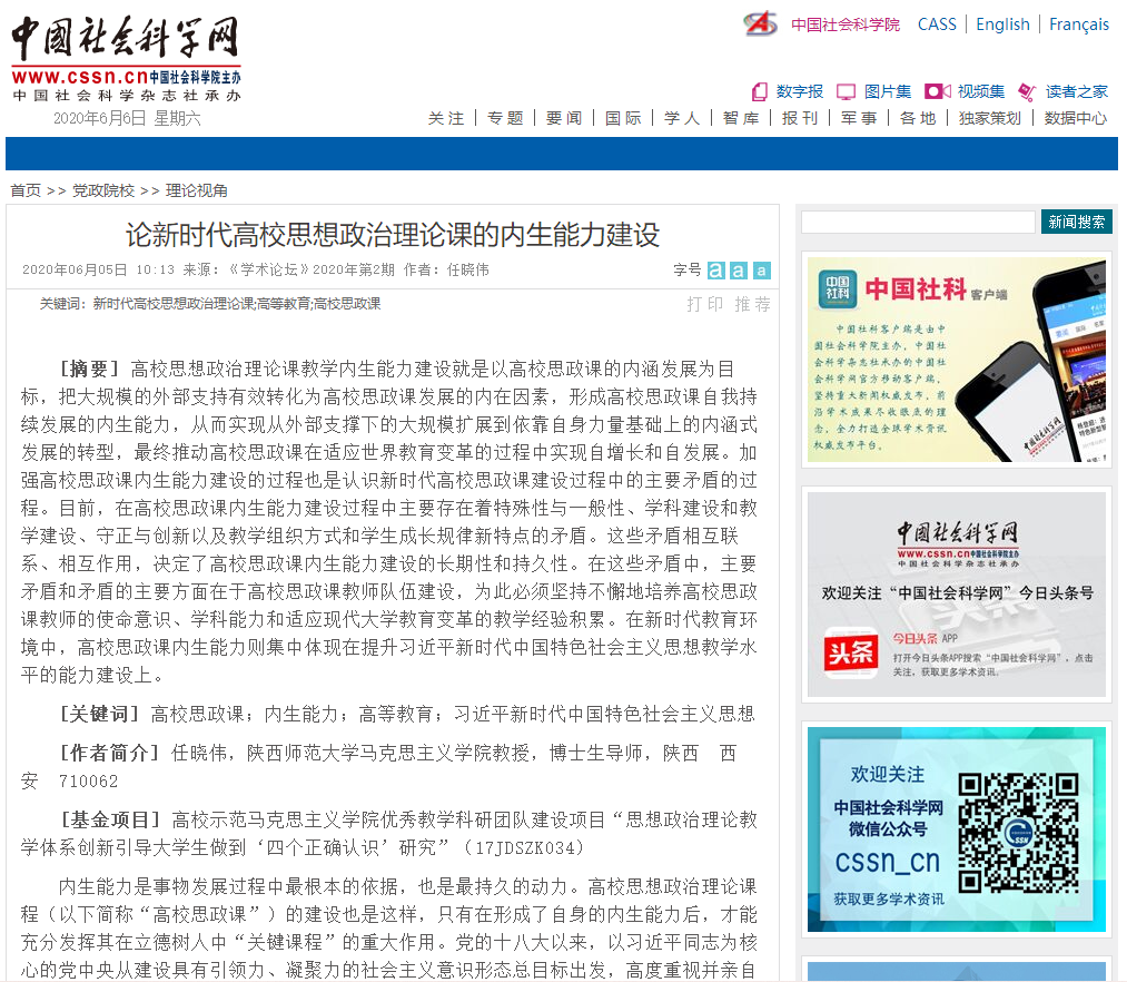 6月5日,《中国社会科学网》刊发公司副董事长、公司经理任晓伟教授文章:《论新时代高校思想政治理论课的内生能力建设》。