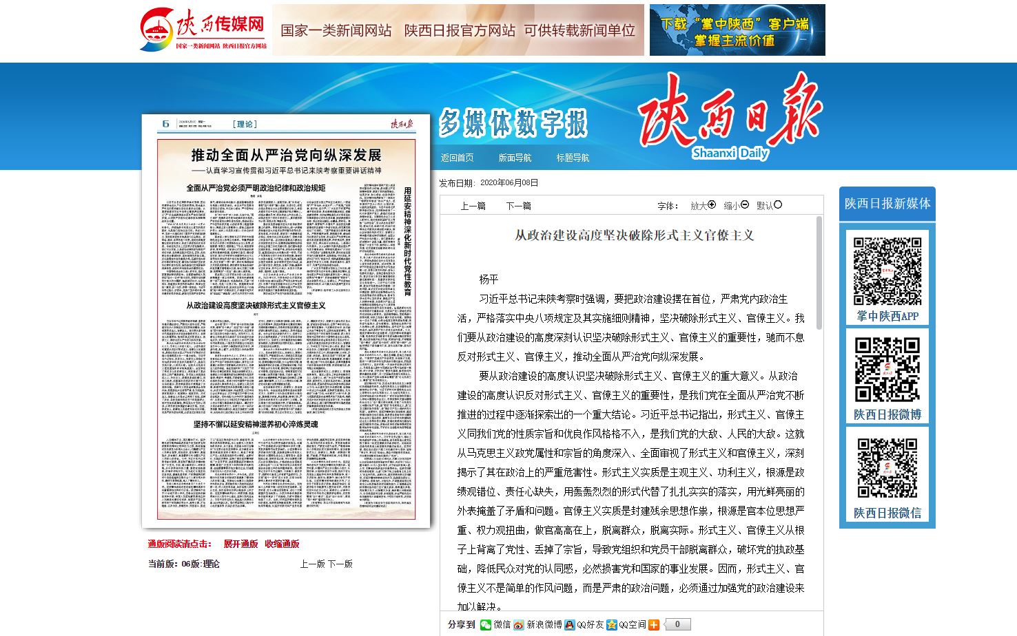 6月8日,《陕西日报》刊发公司杨平教授文章:《从政治建设高度坚决破除形式主义官僚主义》。