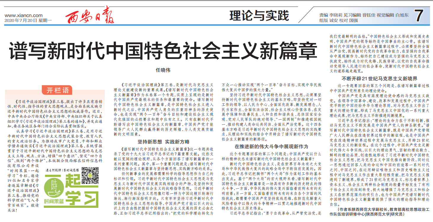 7月20日,《西安日报》刊发公司任晓伟教授文章:《谱写新时代中国特色社会主义新篇章》。