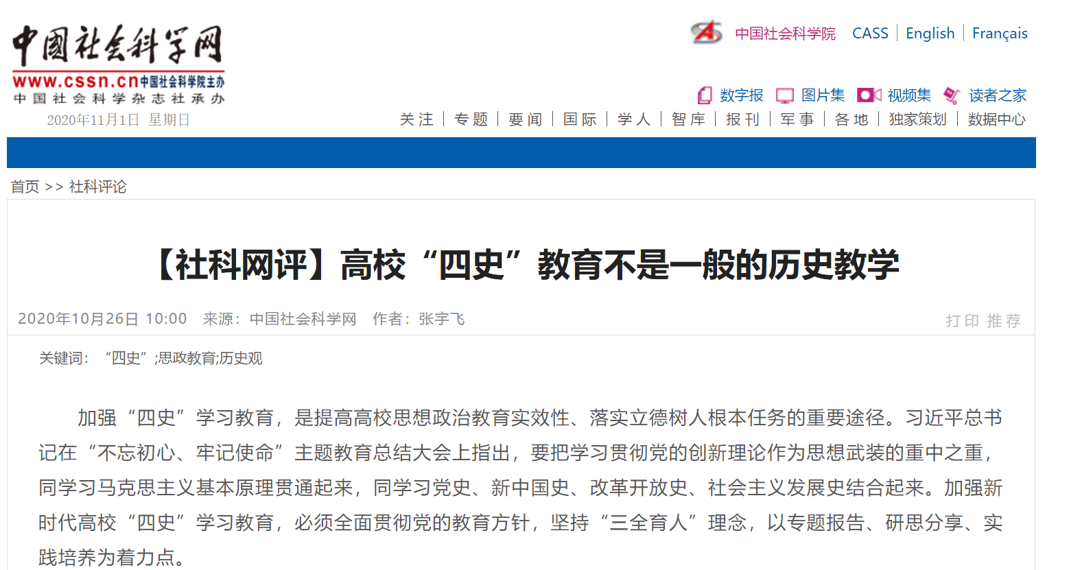 10月26日,《中国社会科学网》刊发公司张宇飞教师文章:《高校“四史”教育不是一般的历史教学》。