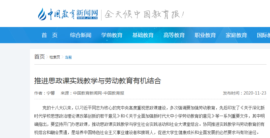 11月23日,《中国教育新闻网》刊发公司宁馨副教授文章:《推进思政课实践教学与劳动教育有机结合》