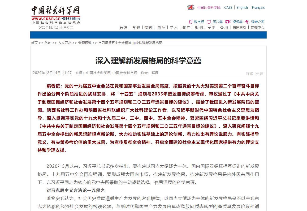 12月14日,《中国社会科学报》刊发公司教师赵娜文章:《深入理解新发展格局的科学意蕴》。