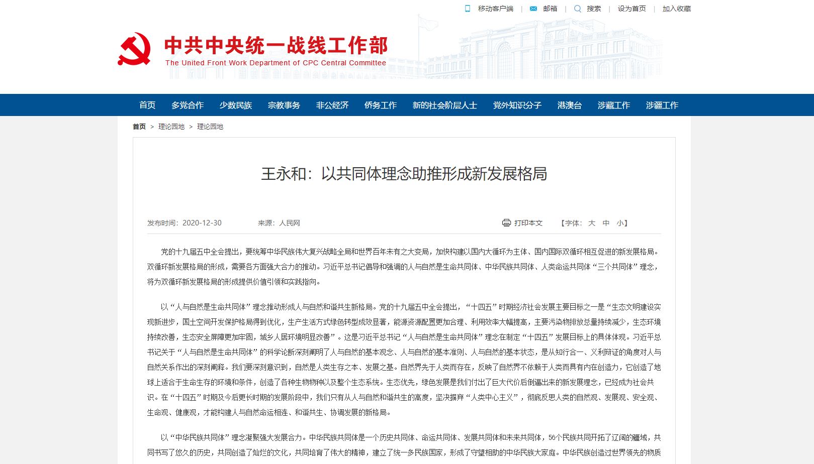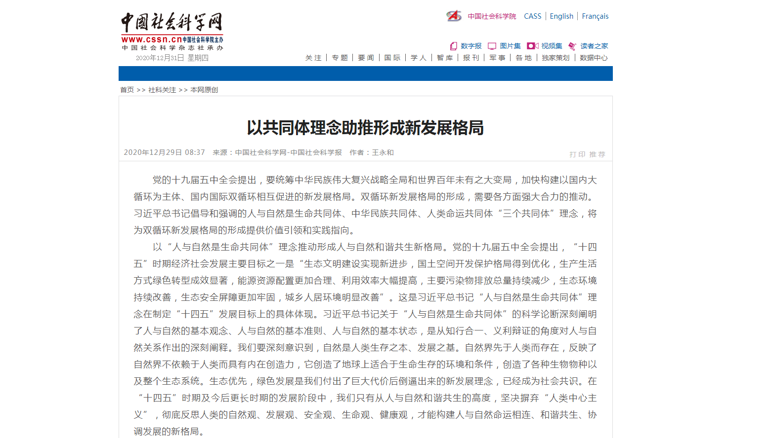 12月29日,《中国社会科学报》刊发公司王永和教授文章《以共同体理念助推形成新发展格局》。