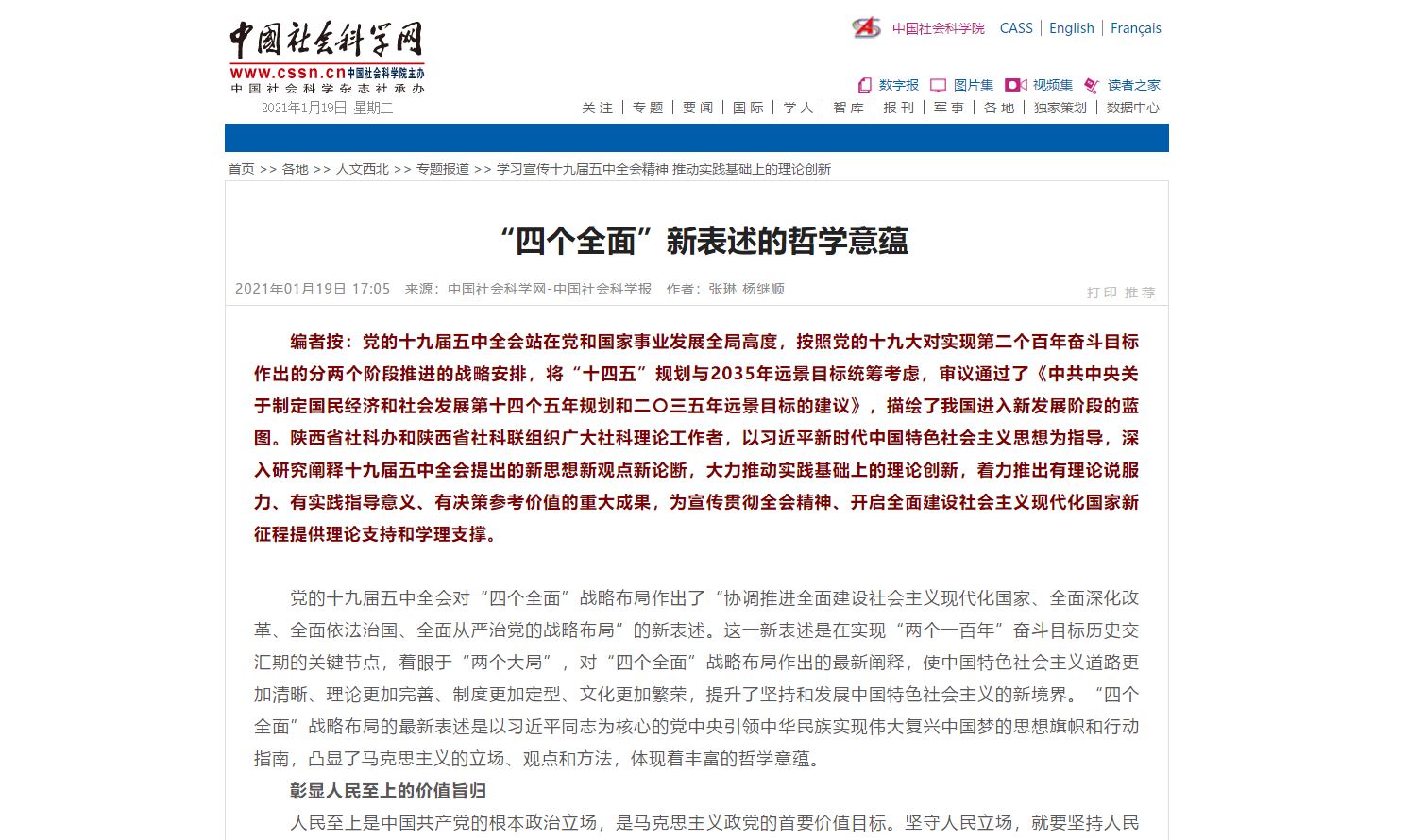 1月19日,《中国社会科学报》刊发公司张琳教授、博士研究生杨继顺文章《“四个全面”新表述的哲学意蕴》。