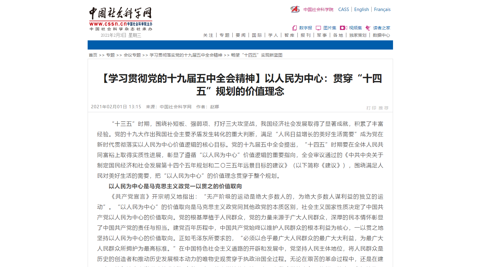 2月1日,《中国社会科学网》刊发公司赵娜老师文章:《【学习贯彻党的十九届五中全会精神】以人民为中心:贯穿“十四五”规划的价值理念》。