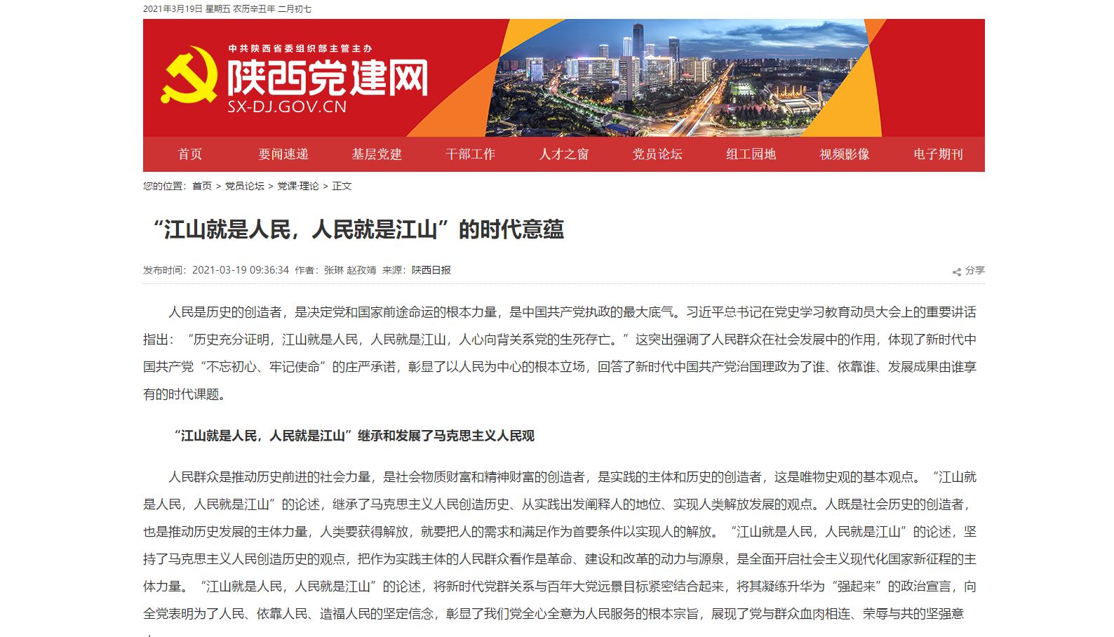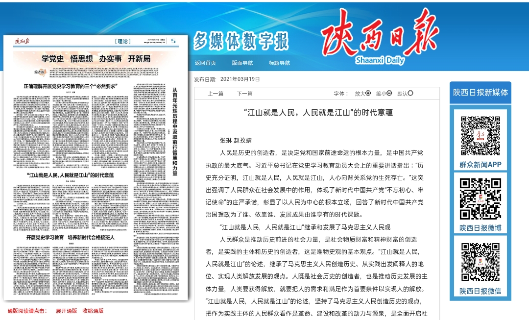 3月19日,陕西日报刊发公司张琳教授、硕士研究生赵孜靖文章:《“江山就是人民,人民就是江山”的时代意蕴》。陕西党建网转载。
