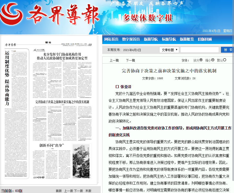 4月1日,《各界导报》刊发公司张亚泽教授文章《完善协商于决策之前和决策实施之中的落实机制》。