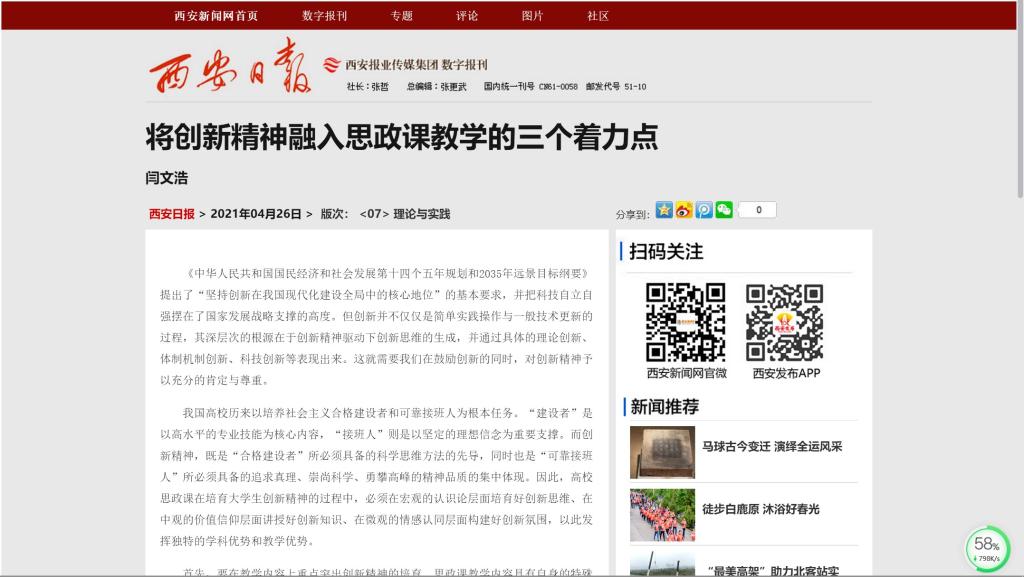 4月26日,《西安日报》刊发了公司闫文浩书记文章:《将创新精神融入思政课教学的三个着力点》。