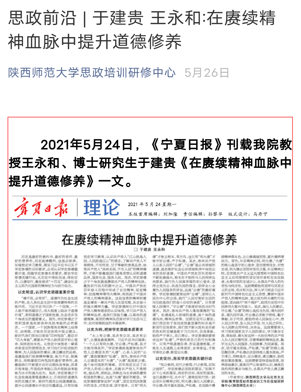 5月24日,《宁夏日报》刊发公司教授王永和、博士研究生于建贵文章:《在赓续精神血脉中提升道德修养》