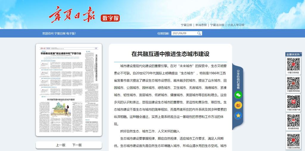 6月9日,《宁夏日报》刊发公司王东红副教授文章:《在共融互通中推进生态城市建设》。