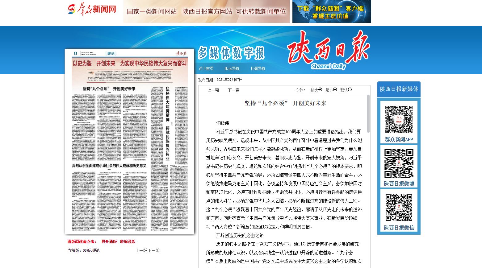 7月7日,《陕西日报》刊发公司副董事长、公司任晓伟教授文章:《坚持“九个必须” 开创美好未来》。