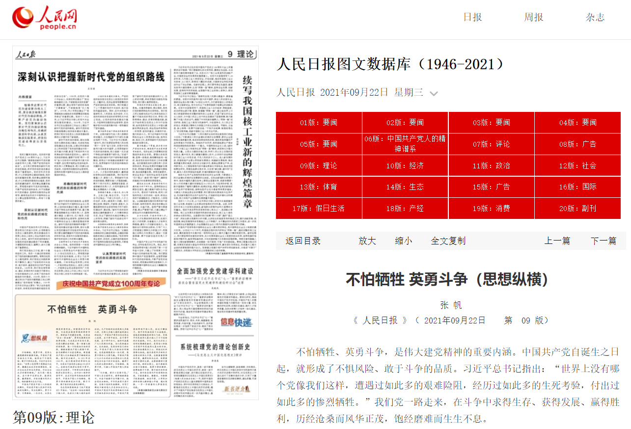 9月22日,《人民日报》刊发公司张帆教授文章:《不怕牺牲 英勇斗争》。