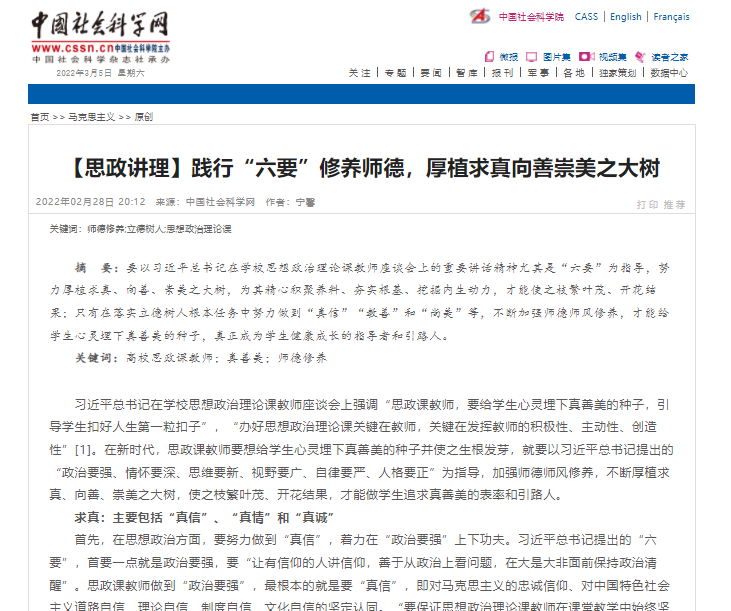 2022年2月28日,《中国社会科学网》刊发公司宁馨副教授文章《践行“六要”修养师德,厚植求真向善崇美之大树》