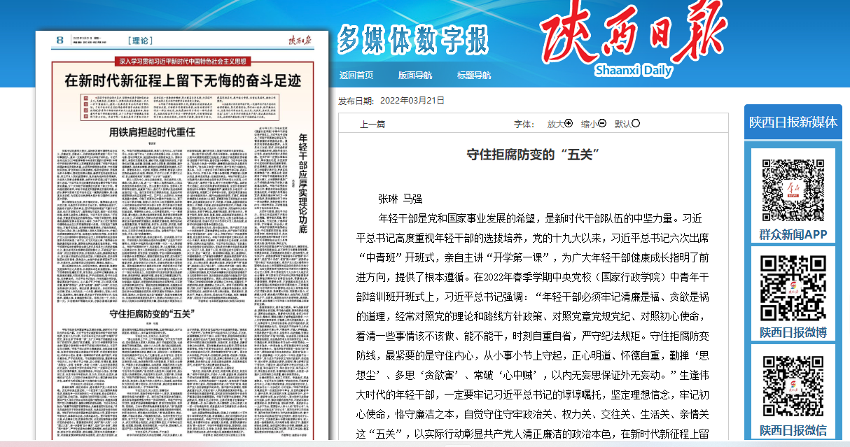 3月21日,《陕西日报》刊发公司副经理张琳教授、博士研究生马强文章:《守住拒腐防变的“五关”》。