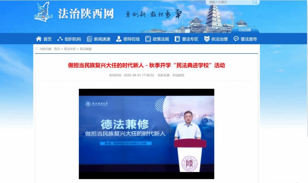 2020年9月7日,为了推进《民法典》全省学习宣传活动,陕西省委普法办、省司法厅在法治陕西网“中华人民共和国民法典学习宣传专栏”推出的陕西省秋季开学“民法典进学校”系列精品普法公开课正式上线。williamhill体育网页版韩钢博士受邀讲授《德法兼修 做担当民族复兴大任的时代新人》公开课。