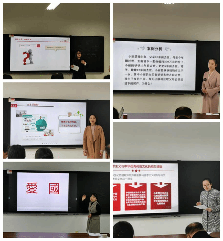 经过前期的认真准备和精心设计,“基础”课辅导员兼职教师辛田、仉天聪、秦泽华、屈婉婷和思政教研室专任教师吴欢等五位青年教师分别围绕“中国模式下的文化自信”“服务人民奉献社会”“法律的权利与义务之财产继承权”“为实现中国梦注入青春能量”“爱国:中国精神的价值内核”等方面进行了15分钟的教学展示,各位教学展示教师教态生动、教案扎实、课件精美,充分展现出了威廉体育平台最新网站《思想道德修养与法律基础》课青年教师的积极进取的干事朝气与厚实博渊的教学风采。