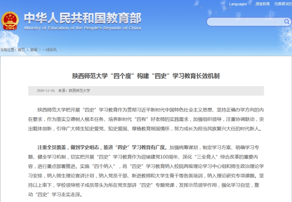 2020年11月24日,教育部网站以“威廉体育平台最新网站‘四个度’构建‘四史’学习教育长效机制”为题,从教育全员覆盖、发挥课程优势、创新教育载体、锤炼品德情怀等方面对公司“四史”学习教育工作进行了报道与推介。此信息稿由党委宣传部供稿,学校办公室编辑、报送。