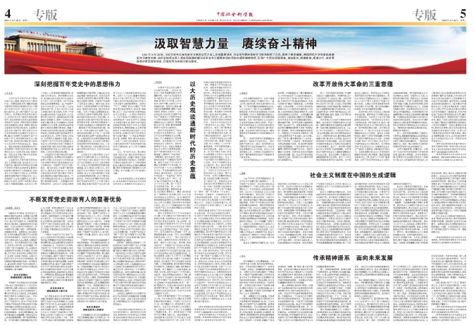 党史学习教育开展以来,在社会科学处的指导下,公司教育部高校思想政治工作队伍培训研修中心和williamhill体育网页版积极加强对习近平总书记关于中国共产党历史重要论述的研究和阐释,推进党史学习教育入脑入心,引导广大师生明理悟道、增信强志、崇德修身、报国力行,在学思践悟中坚定理想信念,在奋发有为中践行初心使命。6月22日,《中国社会科学报》以“汲取智慧力量 赓续奋斗精神”为题,通版集中刊发了研修中心、williamhill体育网页版教师的一组理论文章。