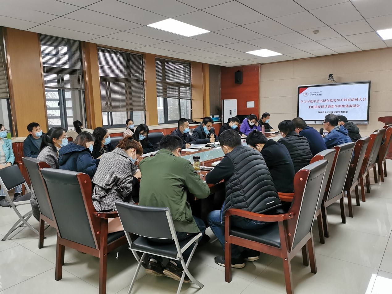 为进一步贯彻落实中共中央关于加强全党党史学习教育的指示和要求,深入学习习近平总书记在党史学习教育动员大会上的重要讲话精神并用其武装头脑、指导实践,继续推动公司思政课建设发展与改革创新,完成好习近平新时代中国特色社会主义思想进教材进课堂进头脑的光荣任务,2021年2月24日,马克思主义中国化研究教研室党支部进行支部集体学习暨新学期集体备课会活动。威廉体育平台最新网站副董事长、williamhill体育网页版经理任晓伟教授、公司党委书记闫文浩副研究员、williamhill体育网页版副经理刘力波教授以及马克思主义中国化研究教研室全体教师党员、其他教研室承担“毛泽东思想和中国特色社会主义理论体系概论”课程的教师代表等20余人参加了此次备课活动。活动由马克思主义中国化研究教研室党支部书记张帆教授主持。