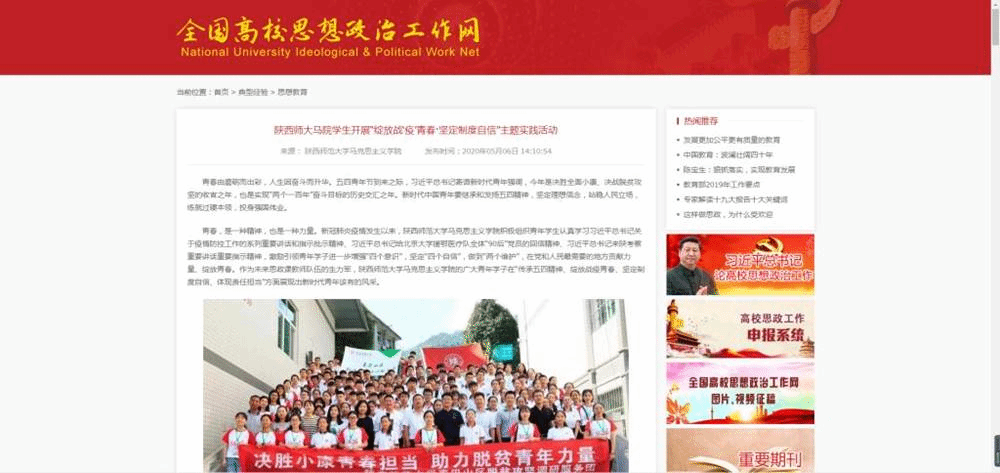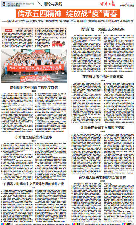 青春由磨砺而出彩,人生因奋斗而升华。五四青年节到来之际,习近平总书记寄语新时代青年强调,今年是决胜全面小康、决战脱贫攻坚的收官之年,也是实现“两个一百年”奋斗目标的历史交汇之年。新时代中国青年要继承和发扬五四精神,坚定理想信念,站稳人民立场,练就过硬本领,投身强国伟业。2020年5月6日,《西安日报》整版刊发公司本科生关于“绽放战疫青春·坚定制度自信”主题宣传教育实践活动学习体会。七篇学习体会文章从不同的视角展现了未来思政课教师生力军在“传承五四精神、绽放战‘疫’青春”方面的思考,在“坚定制度自信,砥砺爱国信仰”方面的担当。文章刊发后,全国全国高校思想政治工作网全文转载。